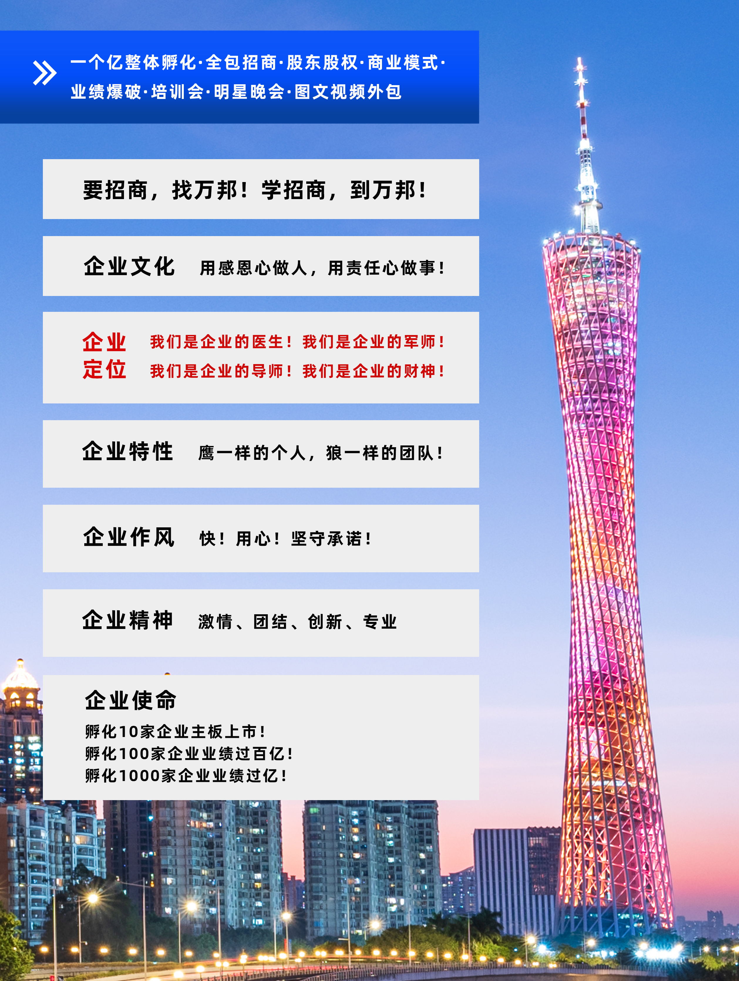 萬邦集團(tuán)成立于2003年6月,專注于為企業(yè)進(jìn)行招商和整體孵化,包含公司診斷、產(chǎn)品定位到量身打造商業(yè)模式系統(tǒng),再到投人、投錢、投資源,一起干的分紅股東招募,鐵血軍團(tuán)的打造,全國招商會議,為企業(yè)建立一套完善;成熟的招商系統(tǒng),教育系統(tǒng)、培訓(xùn)系統(tǒng)。